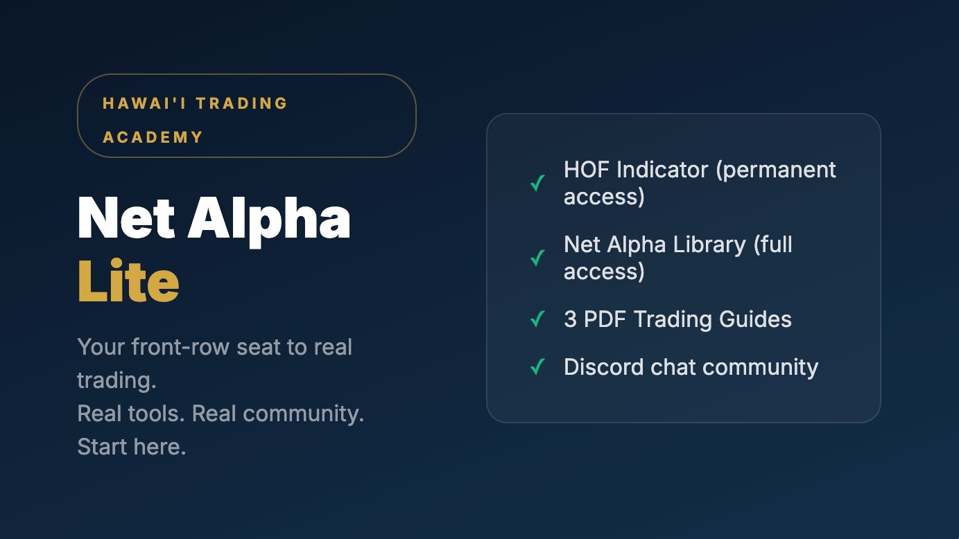 Net Alpha Pro is the complete HTA experience. You get everything in Lite — plus the Ultimate Trading Playbook covering Risk Management, Edge & Strategy, and Psychology & Process. Add in the full HTA Indicator Suite for TradingView, Pro-only Discord channels, and monthly live group coaching calls with Glenn and Reid. This is for traders who are serious about going full-time or getting funded.